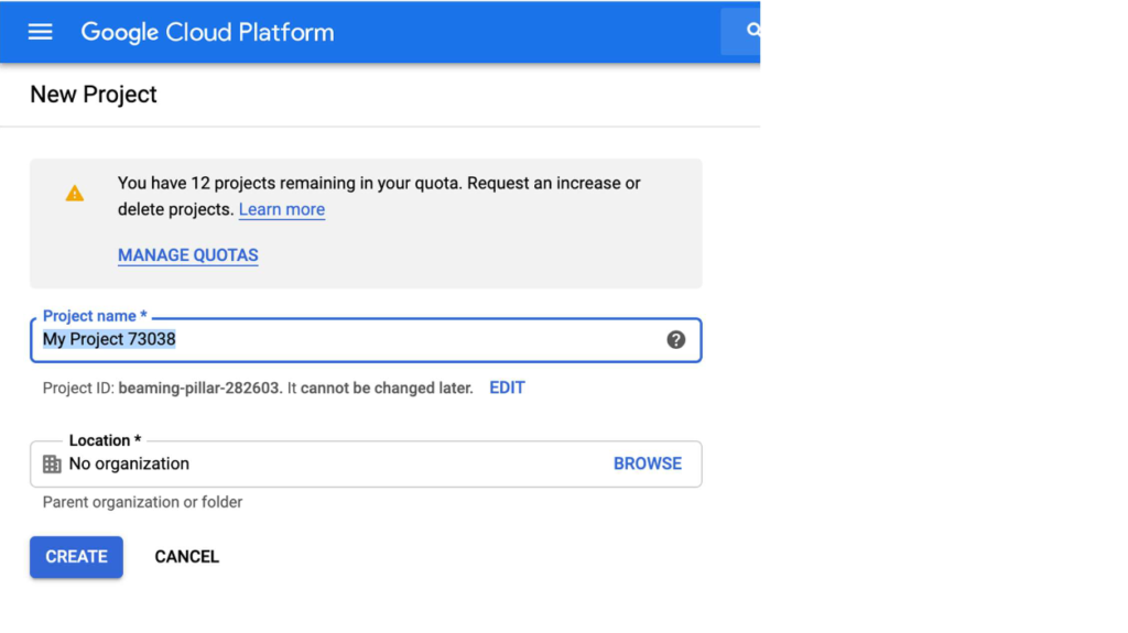 In der Google Cloud Console müssen Sie ein neues Projekt erstellen, das als Container für